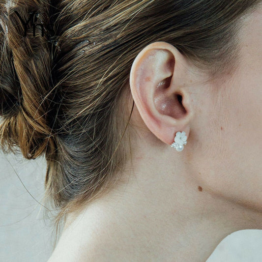 Sterling Silver Mother of Pearl Earrings with CZ Leaf and Dainty Pearl Follower