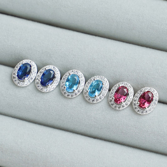 • Sterling Silver Halo Stud Earrings Light Blue Aquamarine / Sapphire Blue / Ruby Red / Clear CZ 4mm x 6mm Main Stone