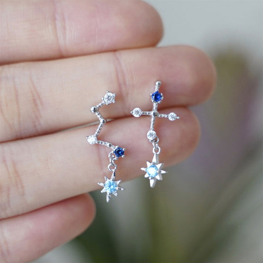 Sterling Silver CZ Big Dipper Blue Polaris Star Cross Climber Drop Earrings