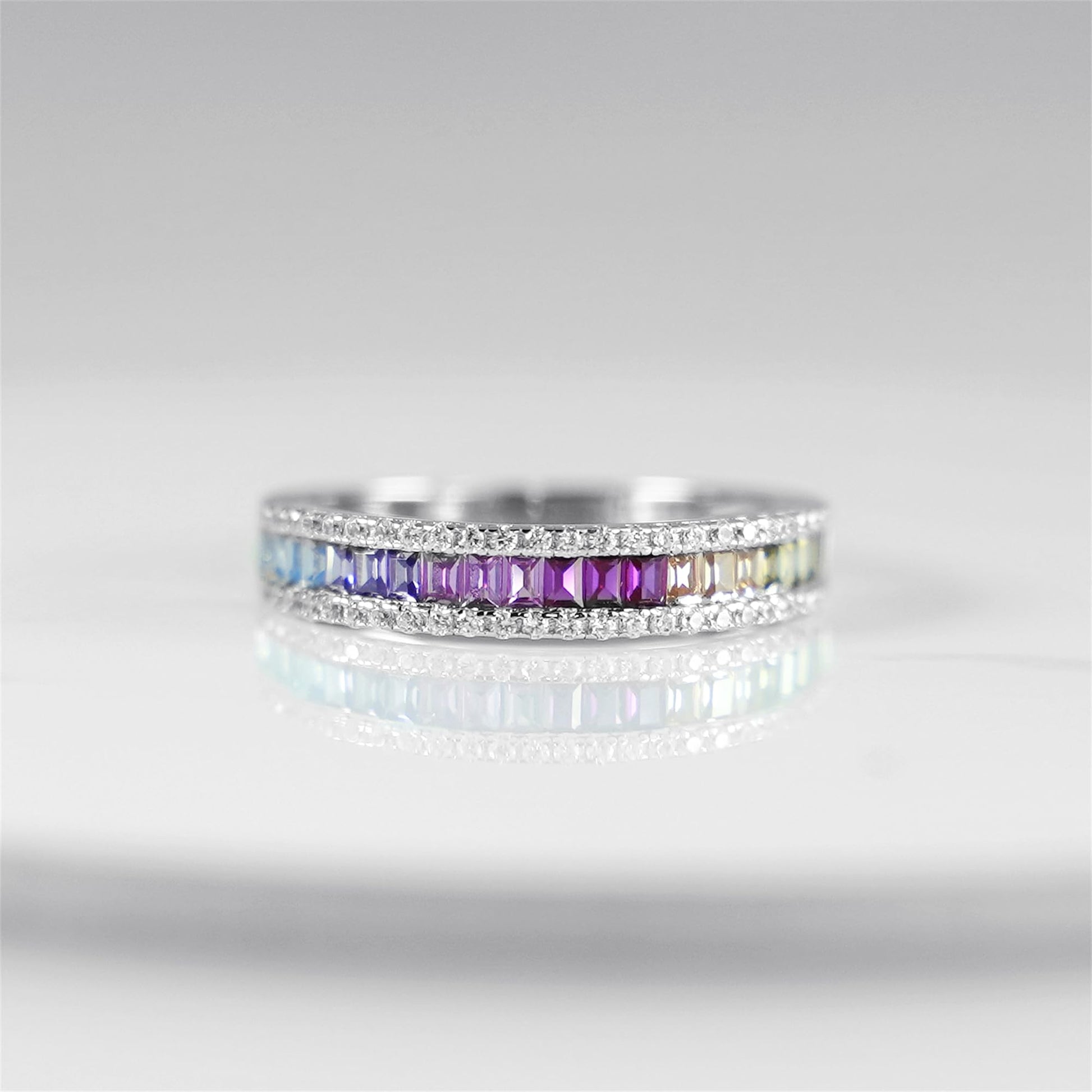Rhodium on Sterling Silver Half Channel Set Baguette Rainbow Multi-Colour CZ Eternity Ring
