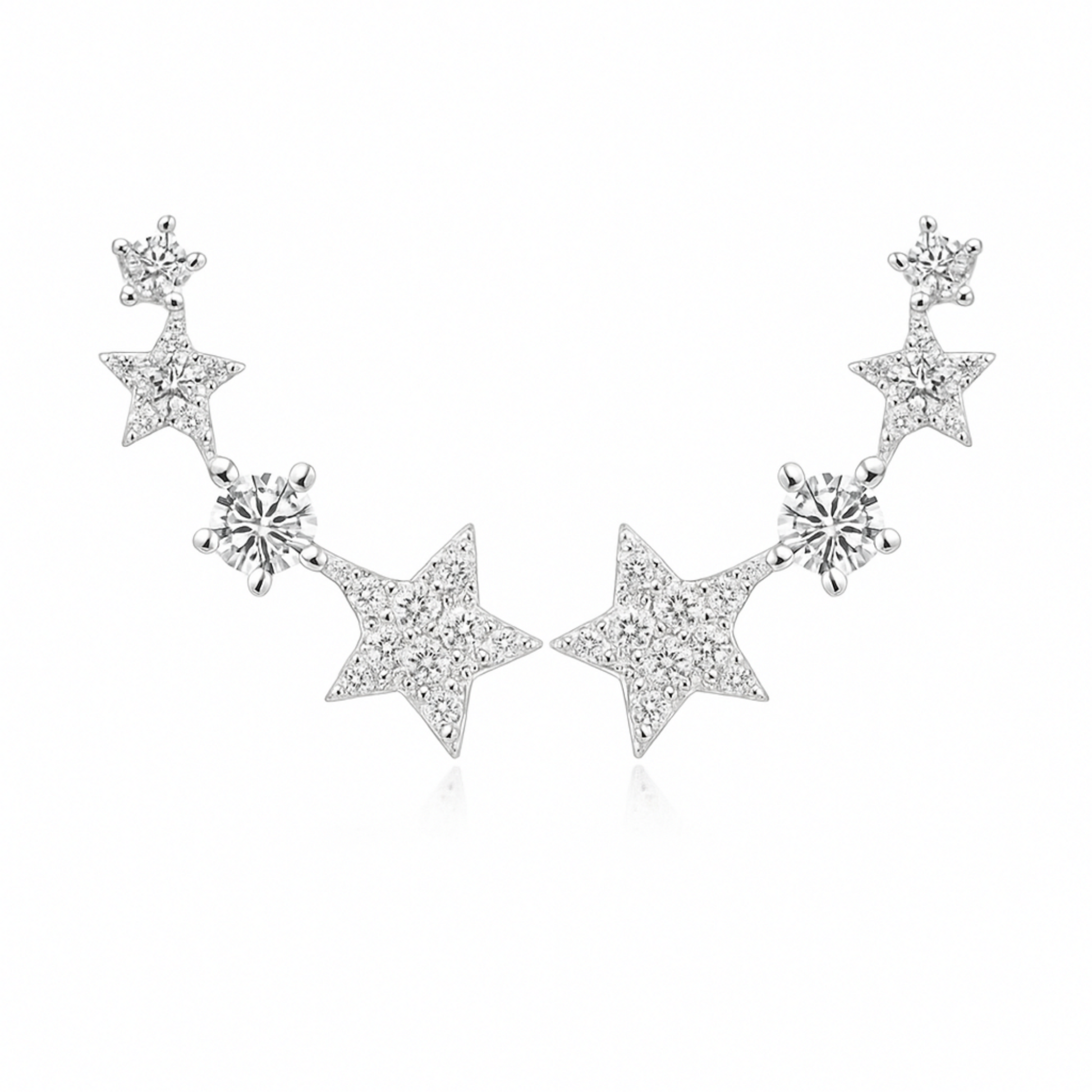 Sterling Silver Linked Lucky CZ Stars Pin Post Climber Crawler Earrings - Boxed