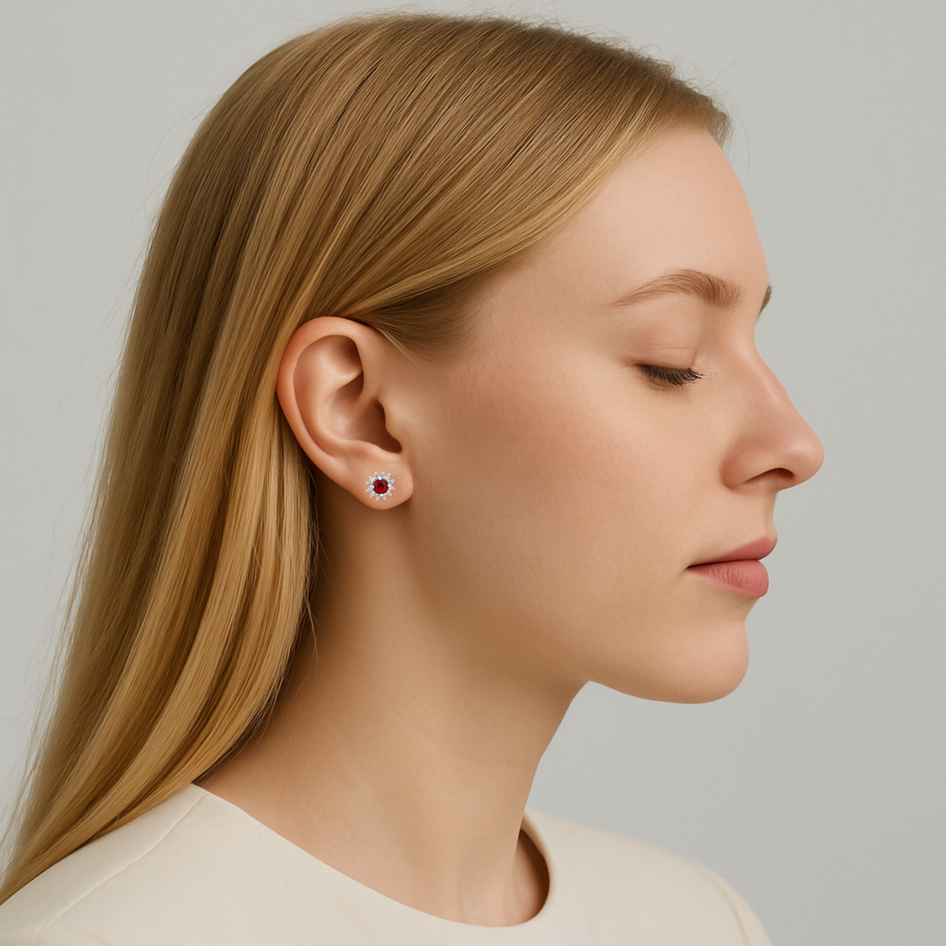 Sterling Silver 4mm Cut Red Pyrope Garnet Colour CZ Round Flower Cluster Stud Earrings  - Boxed