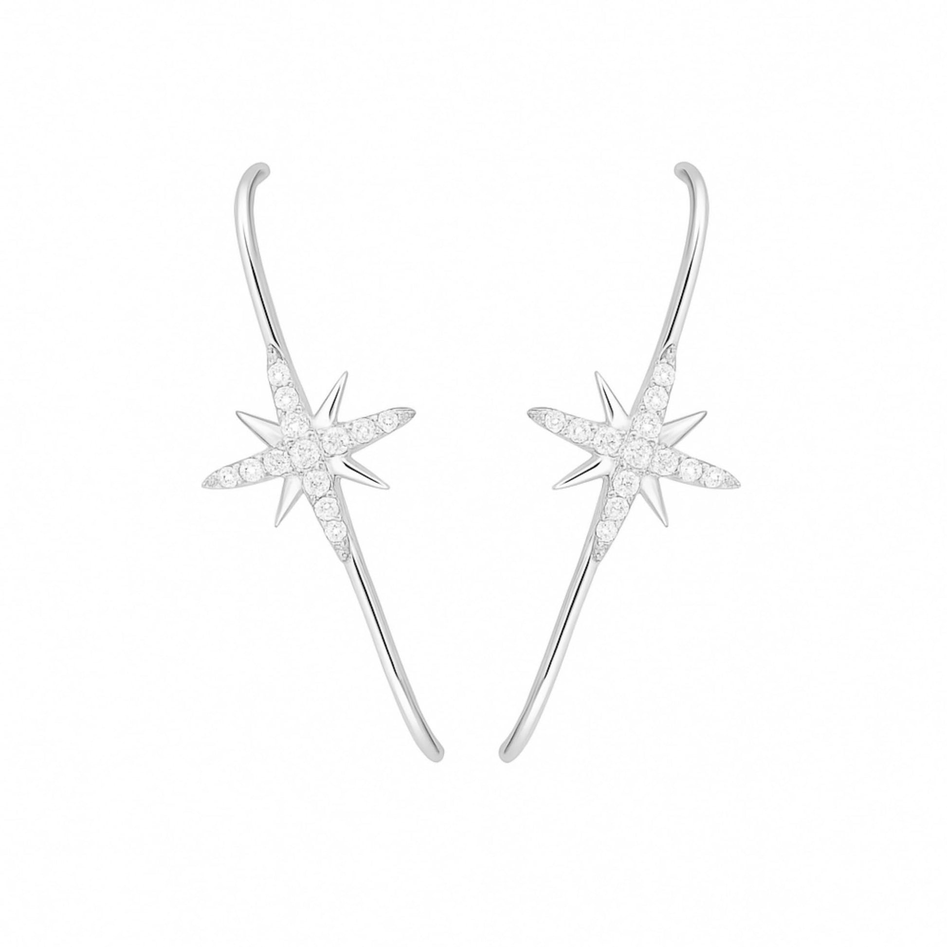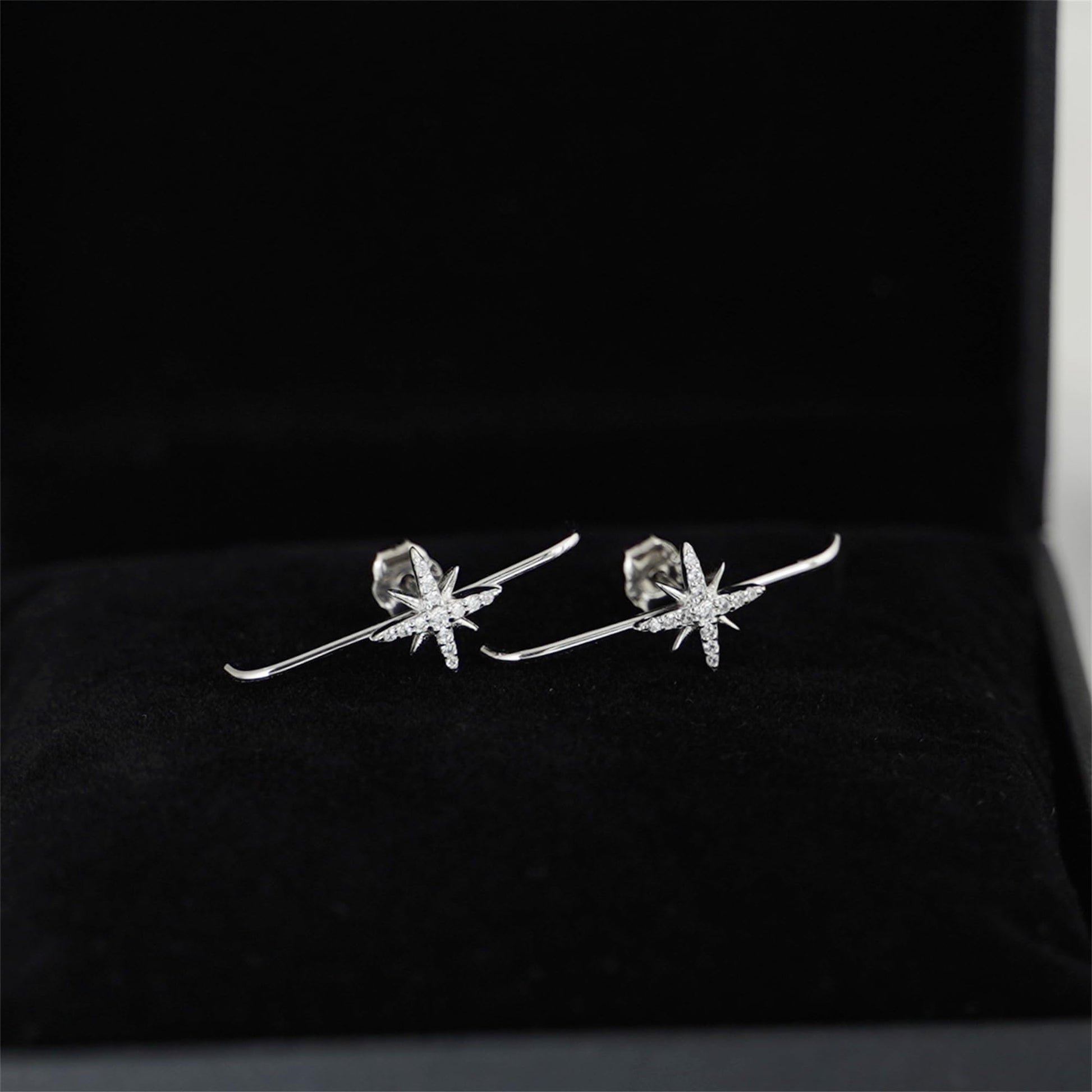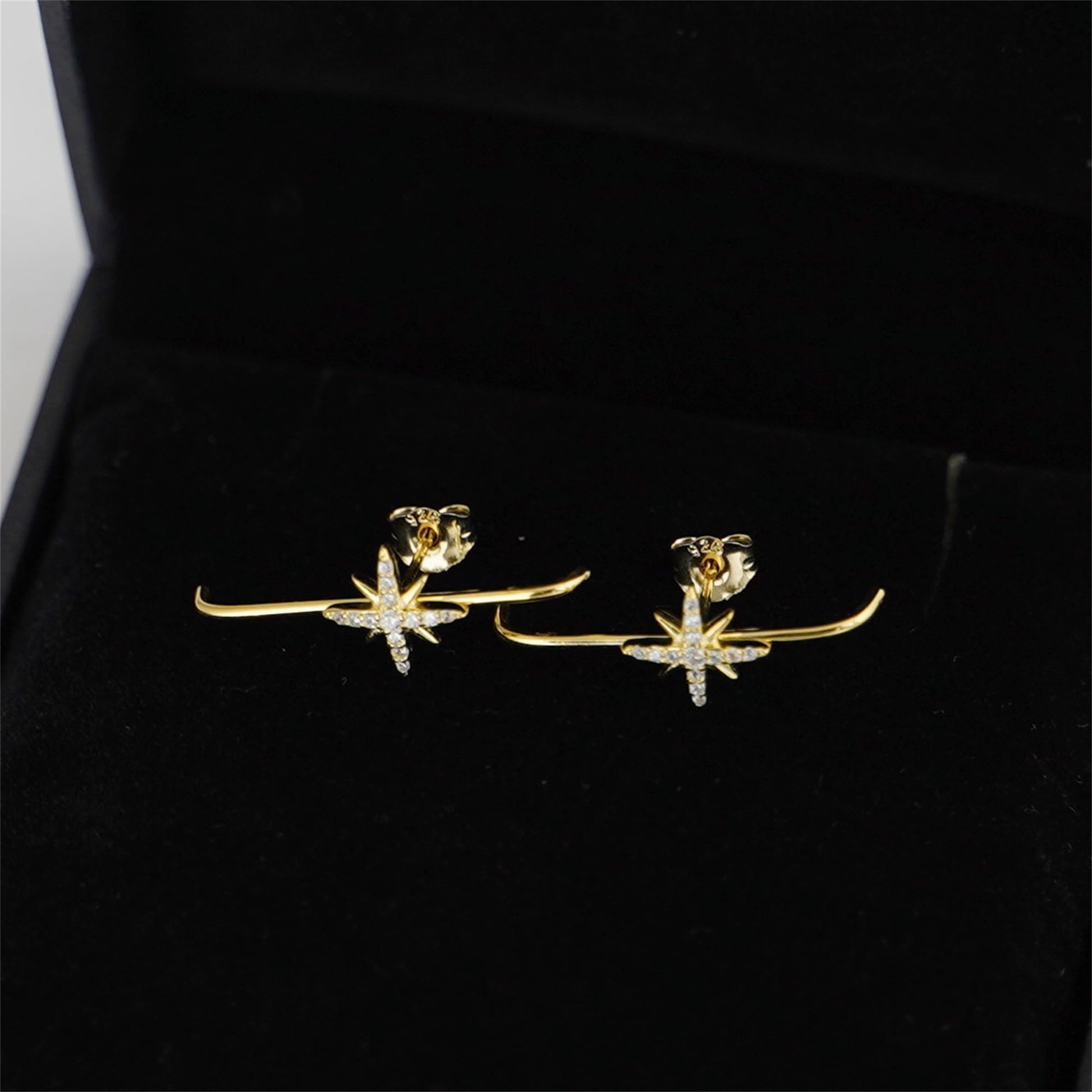 Sterling Silver 9mm North Pole Star Pave CZ Suspender Bar Line Cuff Stud Earrings w Gift Box ITEM SPECIFICS: Earrings Length: 25mm Star Size: 9x9mm Bar Thickness: 1mm Pin Length: 11mm Weight: 1.08g/pair Metal: Sterling Silver Stamped Surface: Rhodium & 18K Gold All Stud Earrings will Include Sterling Silver Butterfly Backs and Rubber Backs