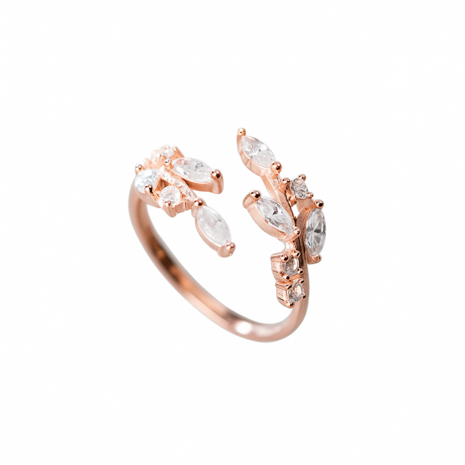 Sterling Silver CZ Leaf Branch Ring Rhodium Rose Gold